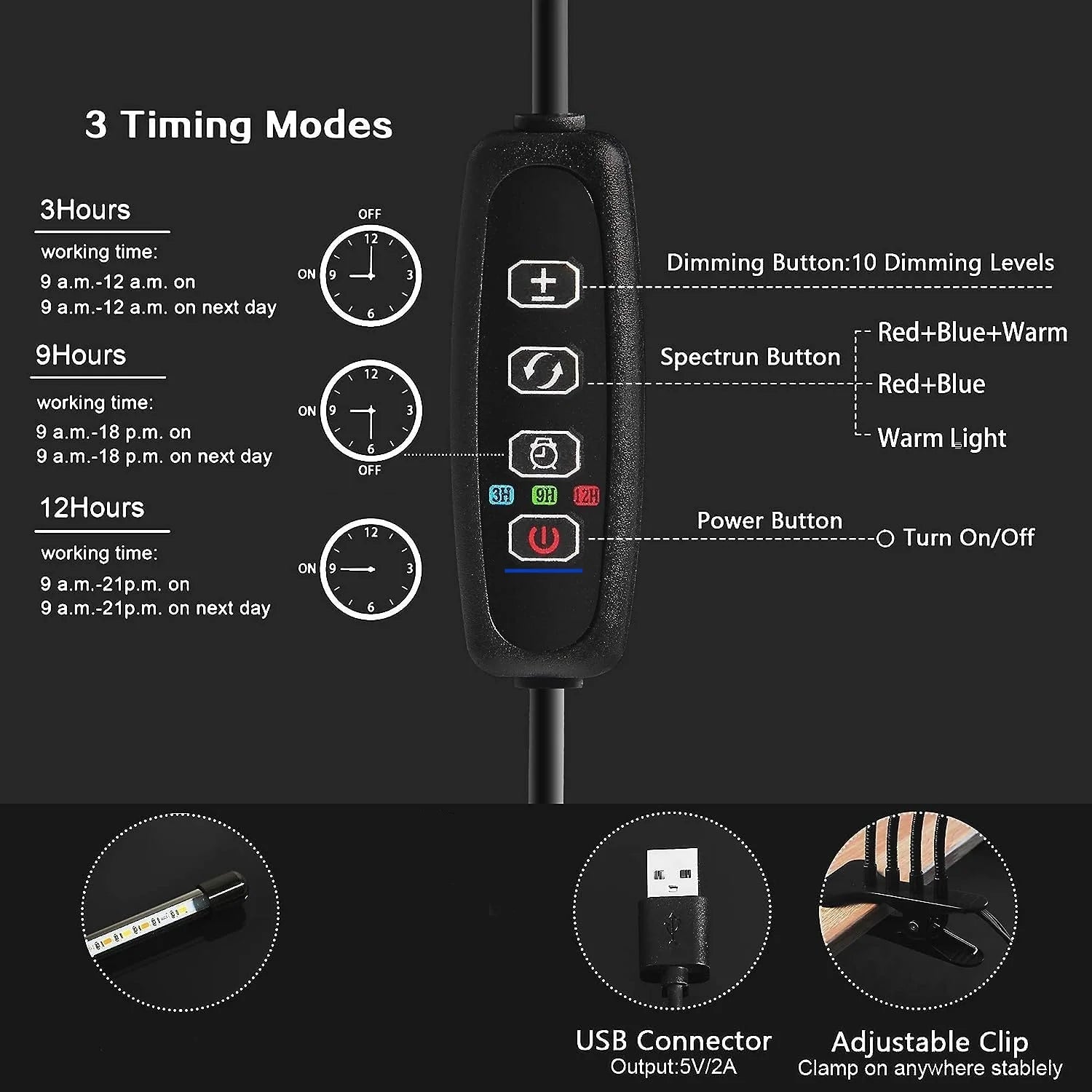 3 Lighting Modes â Switch between Red+Blue, Red+Blue+Warm, or Warm White (full spectrum) to match your plantsâ needs.