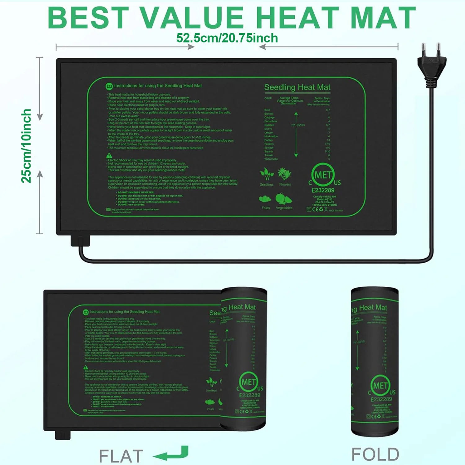 [ Thermostatic Heating Mat]: Made of durable PVC and PET film designed to meet MET standards which is high temperature resistance, corrosion resistant, and Insulative. The heat mat warms soil to around 10'F-20'F above ambient air temperature which provides the optimum environment for seed germination or propagation. The IP67-rated waterproof surface is safe to scrub, helping keep your equipment clean and running properly. At 21 watts, it uses very little power.